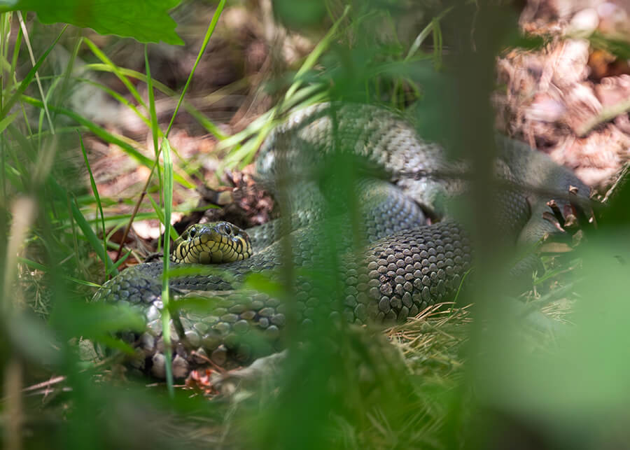 Uważne spojrzenie spomiędzy traw i leśnej ściółki — dorodna samica zaskrońca wygrzewa się w spokojnym zakątku Puszczy Kozienickiej.