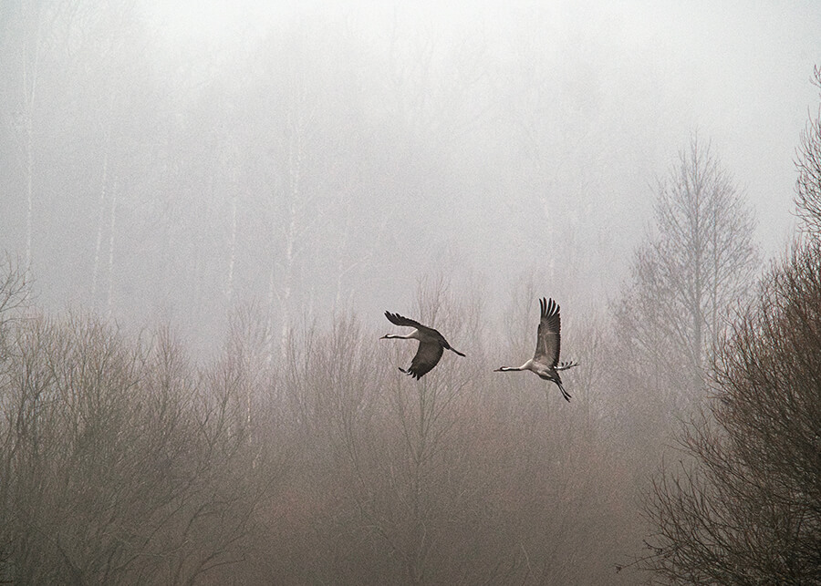 Ulotny moment uchwycony w mglistej scenerii Puszczy Białowieskiej – para żurawi wzbija się do lotu nad jeszcze uśpionym lasem. To chwila przejścia między zimą a wiosną, kiedy natura zaczyna się budzić, a charakterystyczny klangor żurawi zapowiada nadchodzące zmiany.